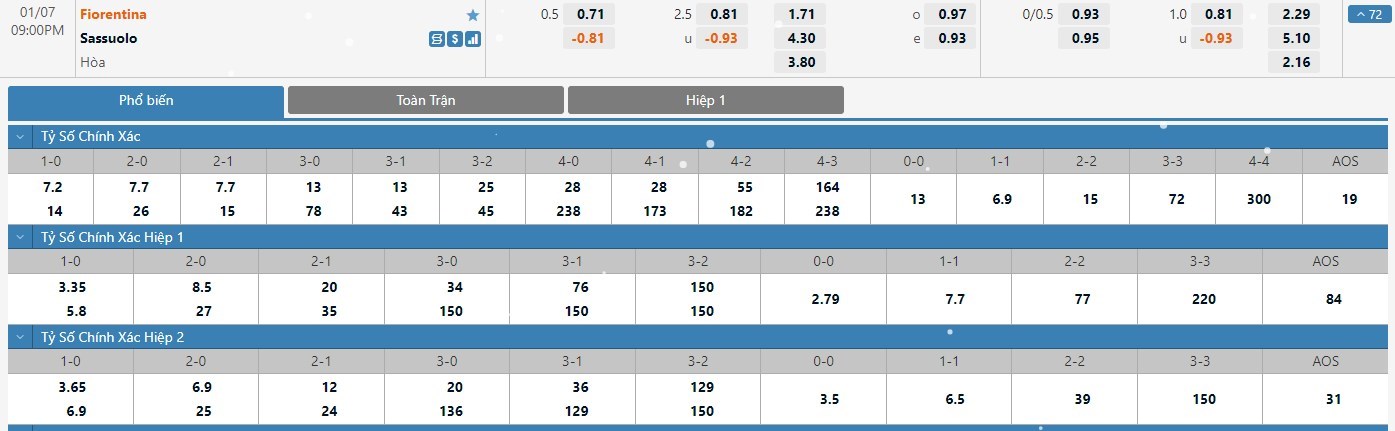Tip kèo tỷ số hiệp 1: Fiorentina 1-1 Sassuolo