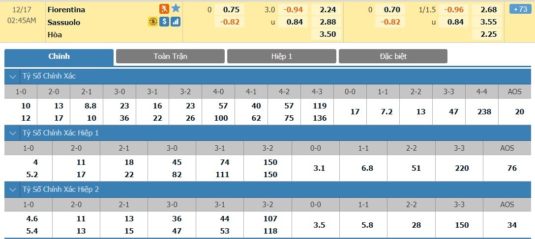 Tip kèo tỷ số hiệp 1: Fiorentina 0-0 Sassuolo
