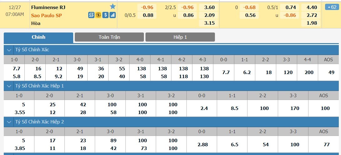 Tip kèo tỷ số hiệp 1: Fluminense 0-0 Sao Paulo