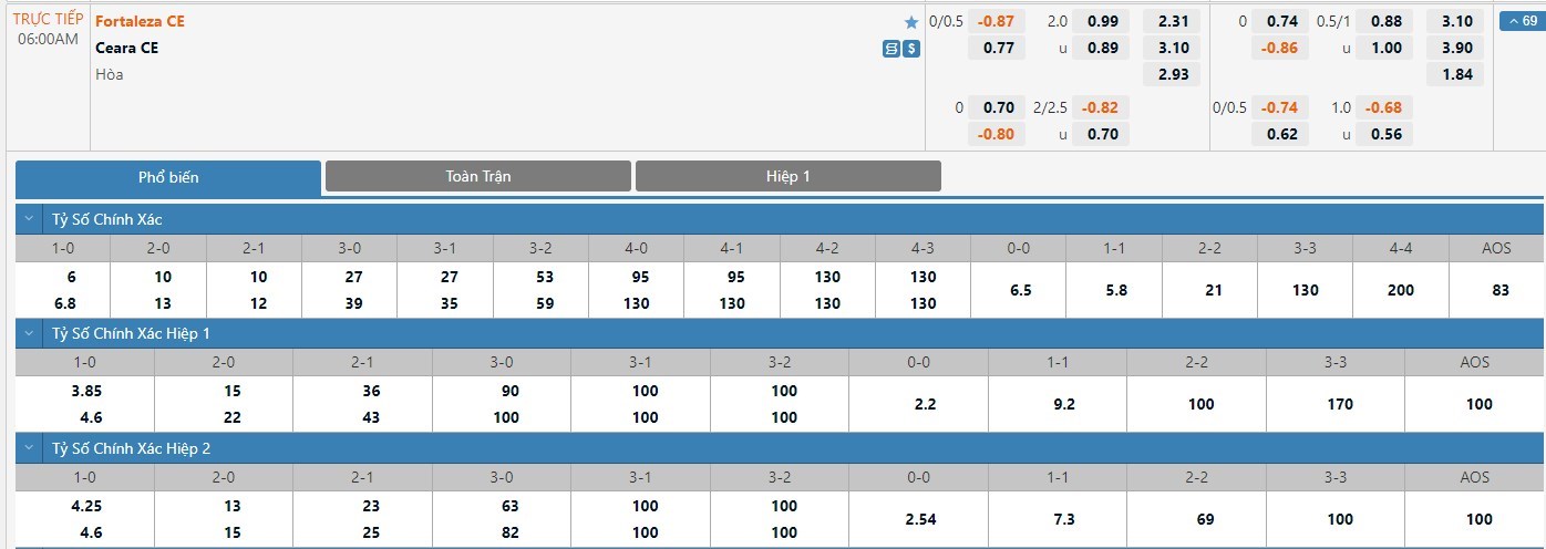 Tip kèo tỷ số hiệp 1: Fortaleza 0-0 Ceara