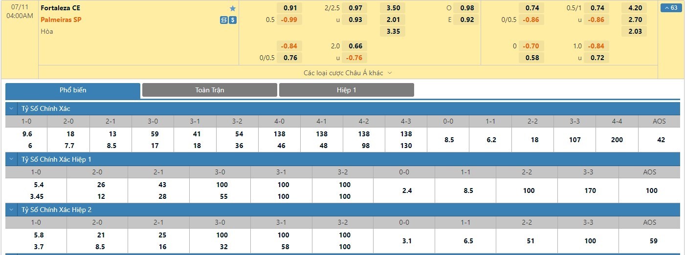 Nếu như Fortaleza sở hữu cho mình ít nhất 1 bàn thắng trong hiệp 1 ở 2/5 trận đấu gần nhất thì Palmeiras chỉ có 1 lần làm được điều này. Với tỷ lệ kèo hiệp 1 là đội khách chấp tỷ lệ -1/4 trái thì người chơi nên tin tưởng vào đội chủ nhà ở cuộc đối đầu này. Tỷ lệ kèo được đưa ra ở cuộc đối đầu này đang là -1/2 trái nghiêng về Palmeiras và điều này rõ ràng là rất hợp lý vào thời điểm hiện tại. Mặc dù ở trận đấu gần đây nhất Fortaleza là đội bóng được thắng lợi nhưng với những gì đang trình diễn gần đây thì Palmeiras rõ ràng vẫn được đánh giá cao hơn nhiều. Do đó, các nhà đầu tư nên tin tưởng vào Palmeiras ở cuộc đối đầu này để có cơ hội thắng kèo cao hơn.