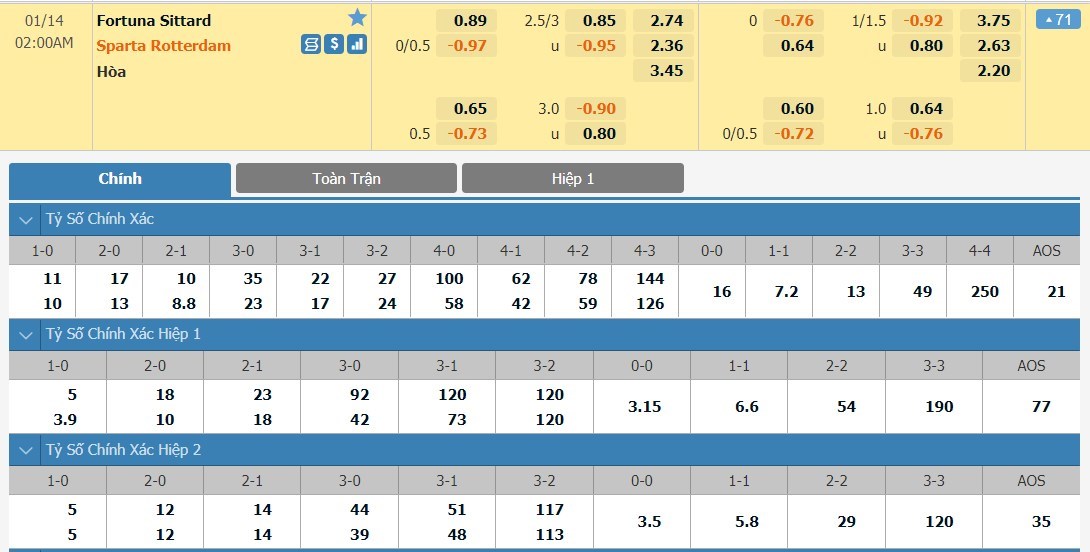 Tip kèo tỷ số hiệp 1: Fortuna Sittard 1-1 Sparta Rotterdam
