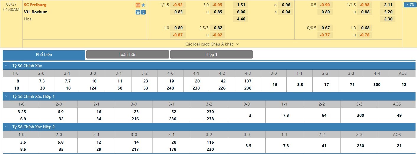Trong 5 trận đấu gần nhất của mình, Freiburg đã có 3 trận đấu mang về được cho mình ít nhất là 1 bàn thắng trong hiệp đấu đầu tiên. Thống số này nếu xét ở phía Bochum thì họ đã có được cho mình 4 lần. Tỷ lệ kèo hiệp 1 ở trận đấu này được đưa ra là Freiburg chấp -1/2 trái và người chơi nên tin tưởng vào đội chủ nhà để có cơ hội thắng kèo cao hơn. Hàng phòng ngự vừa hứng chịu 7 bàn thua trong lượt trận vừa qua của Bochum rõ ràng là không thể đặt niềm tin.