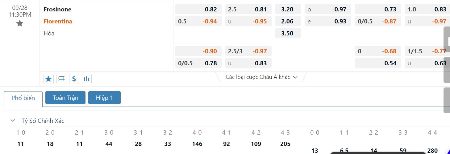 Tip kèo tỷ số hiệp 1: Frosinone 0-0 Fiorentina