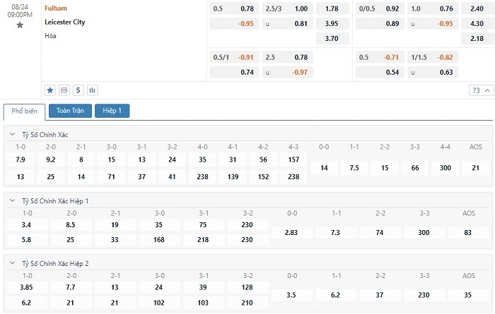 Vì lẽ đó, việc nhà cái đặt đội chủ nhà Fulham ở thế cửa trên cũng là điều dễ dàng lý giải. Dẫu sao, Fulham cũng mang tới sự tín nhiệm lớn hơn nếu nhìn vào thành tích thắng 3/5 trận gần nhất của đội bóng này. Bên cạnh đó, lịch sử đối đầu cũng đang ủng hộ cho Fulham. Ở mùa giải trước, Fulham đã vượt qua Leicester City trong cả 2 lượt trận. Những màn so tài giữa Fulham và Leicester City thường có xu hướng xuất hiện bàn thắng sớm ngay trong hiệp 1. Có tới 9/10 lần đụng độ gần nhất của họ có bàn thắng ở hiệp đấu đầu tiên. Vì vậy mà người hâm mộ có thể chờ đợi vào kịch bản hai đội sẽ thi triển lối đá tấn công ăn miếng trả miếng hấp dẫn ngay sau tiếng còi khai cuộc.