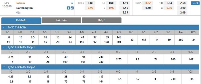Với Fulham, họ chỉ thua 2 qua 8 trận trên sân nhà gần đây. Southampton được cho chưa thể trở lại với sự ổn định, thế nên đây là cơ hội rất tốt để Fulham tự tin hướng đến 3 điểm. Trong con mắt các nhà đầu tư thì Southampton không phải ô cược đáng tin khi mà đội bóng này đã thua kèo châu Á cả 6 trận liên tiếp gần đây. Từ những gì đã phân tích thì người chơi nên lựa chọn ô cược Fulham kèo đấu này. 2 trận đấu gần đây Fulham đều ghi bàn trong hiệp 1. 3 trận thua gần nhất của Southampton vừa qua đều chứng kiến họ thua từ 0-1 trở lên ngay trong 45 phút đầu tiên. Rõ ràng đây là điều mà Fulham có thể tận dụng được để dẫn trước Southampton ở hiệp đầu tiên trên sân nhà.