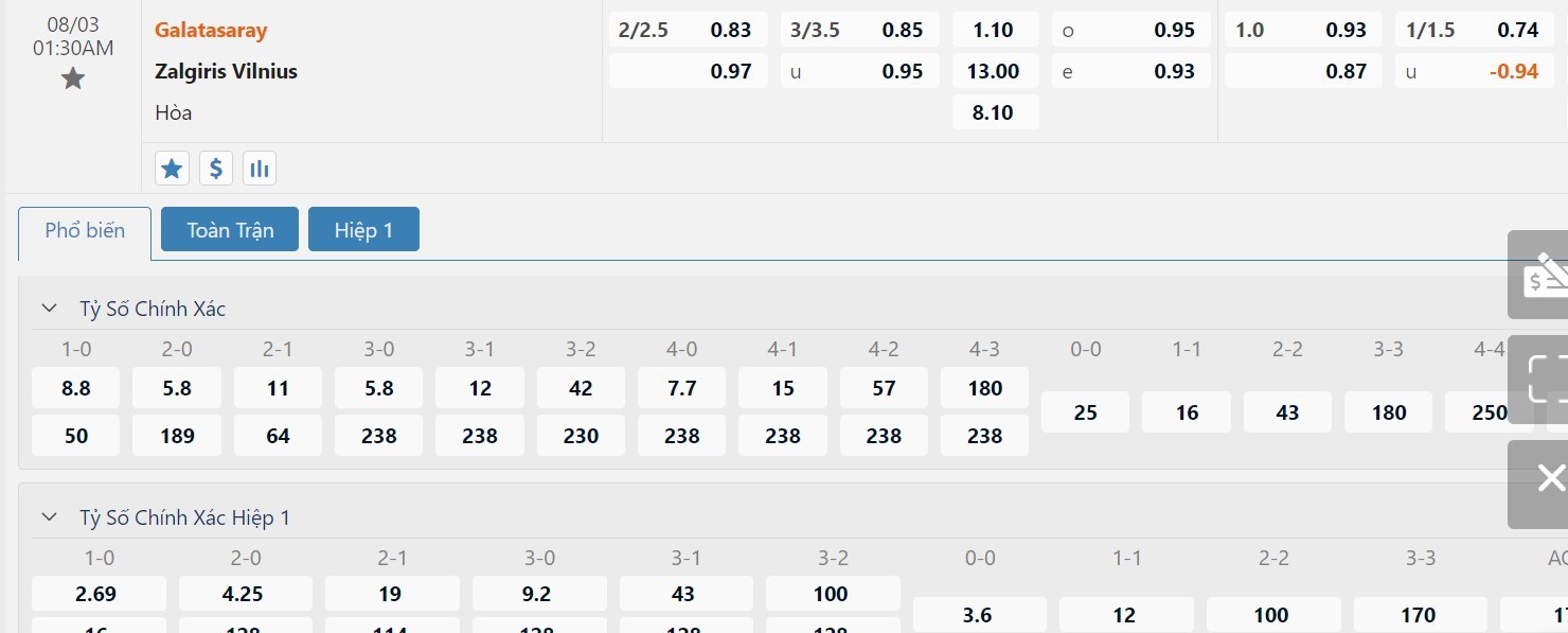 Trong 5 trận đấu gần nhất của mình, Galatasaray đã có 3 trận đấu mang về được cho mình ít nhất là 1 bàn thắng trong hiệp đấu đầu tiên. Còn với Zalgiris đội bóng này đã có 3 lần làm được điều này trong 45 phút đầu tiên. Với tỷ lệ kèo hiệp 1 là -1 trái thì các nhà đầu tư nên tin tưởng vào đội chủ nhà ở trong hiệp đấu đầu tiên này.
