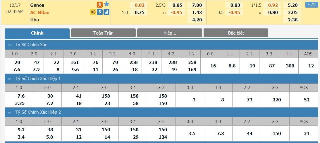 Tip kèo tỷ số hiệp 1: Genoa 0-1 AC Milan