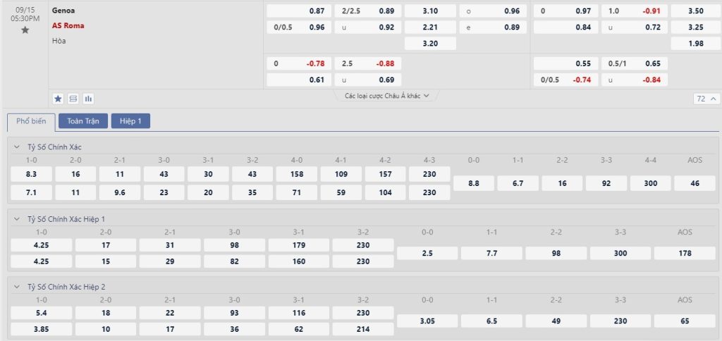 Tip kèo tỷ số hiệp 1: Genoa 0-0 AS Roma