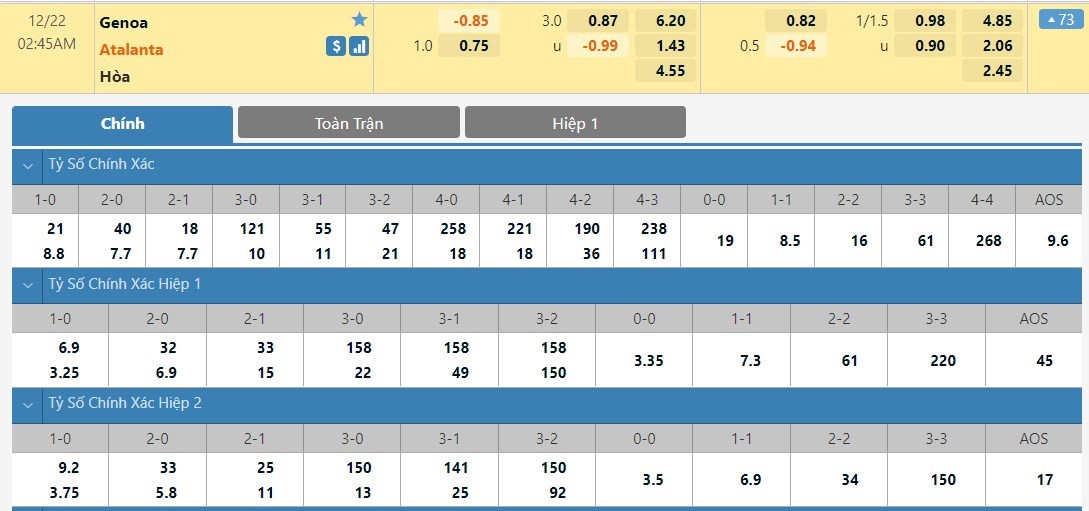 Tip kèo tỷ số hiệp 1: Genoa 0-1 Atalanta