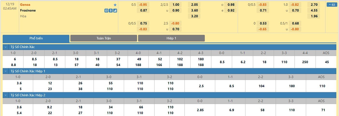 Tip kèo tỷ số hiệp 1: Genoa 0-0 Frosinone