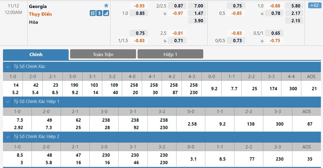 Tip kèo tỷ số hiệp 1: Georgia 0-1 Thụy Điển