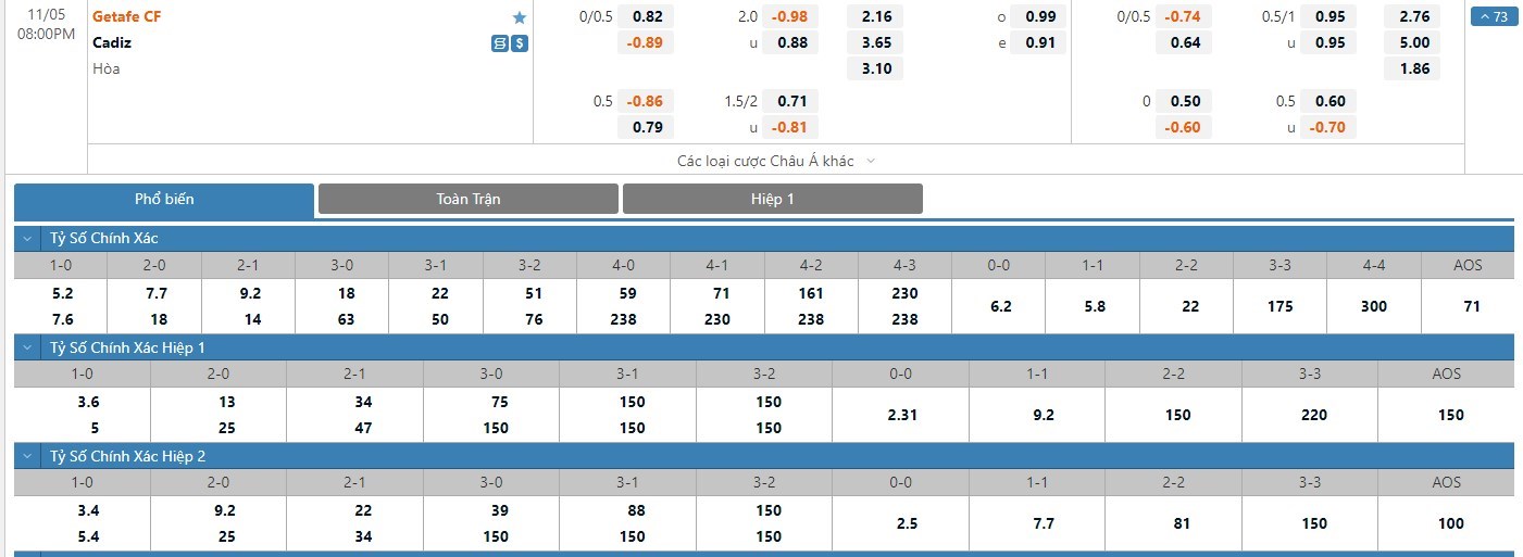 Tỷ lệ kèo được đưa ra ở cuộc đối đầu này là -1/4 trái nghiêng về Getafe và điều này là không có gì phải bàn cãi quá nhiều. Ngoài ra, ở 5 lần gần nhất hai đội bóng này đụng độ nhau trực tiếp thì Getafe cũng đang có được cho mình thành tích đối đầu tốt hơn. Các nhà đầu tư nên tin tưởng vào đội chủ nhà ở trận này để mang về cho mình cơ hội thắng kèo cao hơn. Trong 5 trận đấu gần nhất hai đội bóng này đụng độ nhau trực tiếp, Getafe có tới 4 trận đấu mang về được cho mình ít nhất là 1 bàn thắng trong hiệp đấu đầu tiên. Còn với Cadiz, đội bóng này đã có 2 lần làm được điều này trong 45 phút đầu tiên. Với tỷ lệ kèo hiệp 1 ở trận đấu này được đưa ra là Getafe -1/4 trái thì người chơi nên tin tưởng vào đội chủ nhà trận này.