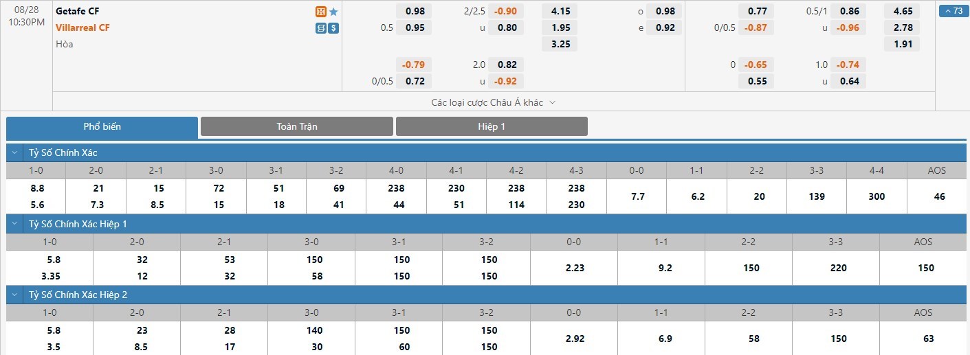Trong 5 trận đấu gần nhất hai đội bóng này đối đầu trực tiếp với nhau, trong khi Villarreal mang về cho mình 3 trận đấu ghi được ít nhất 1 bàn ở hiệp 1 thì Getafe chỉ mang về cho mình đúng 1 lần. Tỷ lệ kèo hiệp 1 ở trận đấu này được đưa ra là Villarreal chấp -1/4 trái thì người chơi nên tin tưởng vào đội khách để có sự an toàn lớn hơn.