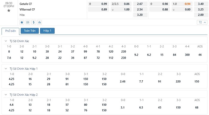 Tip kèo tỷ số full time: Getafe 0-1 Villarreal