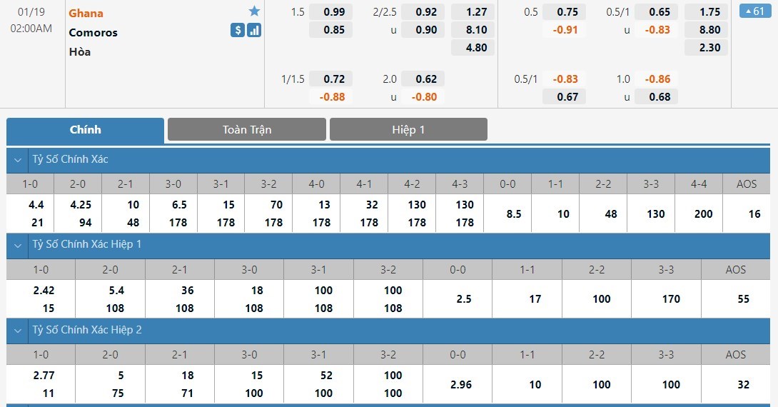 Tip kèo tỷ số hiệp 1: Ghana 1-0 Comoros