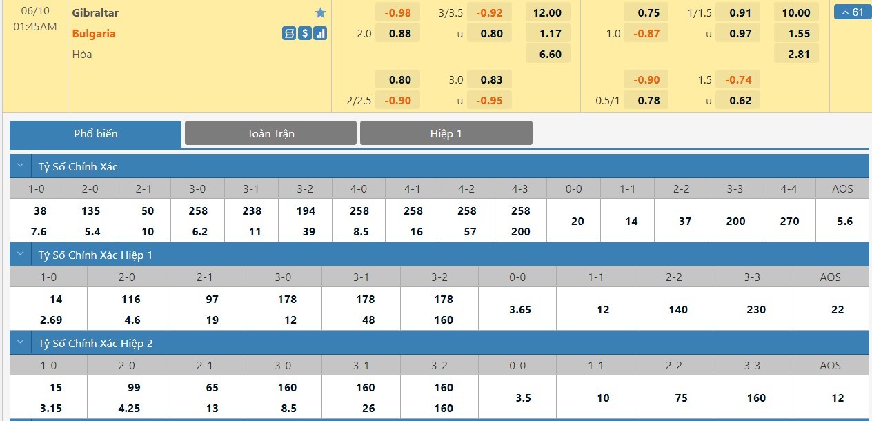 Tip kèo tỷ số hiệp 1: Gibraltar 0-2 Bulgaria