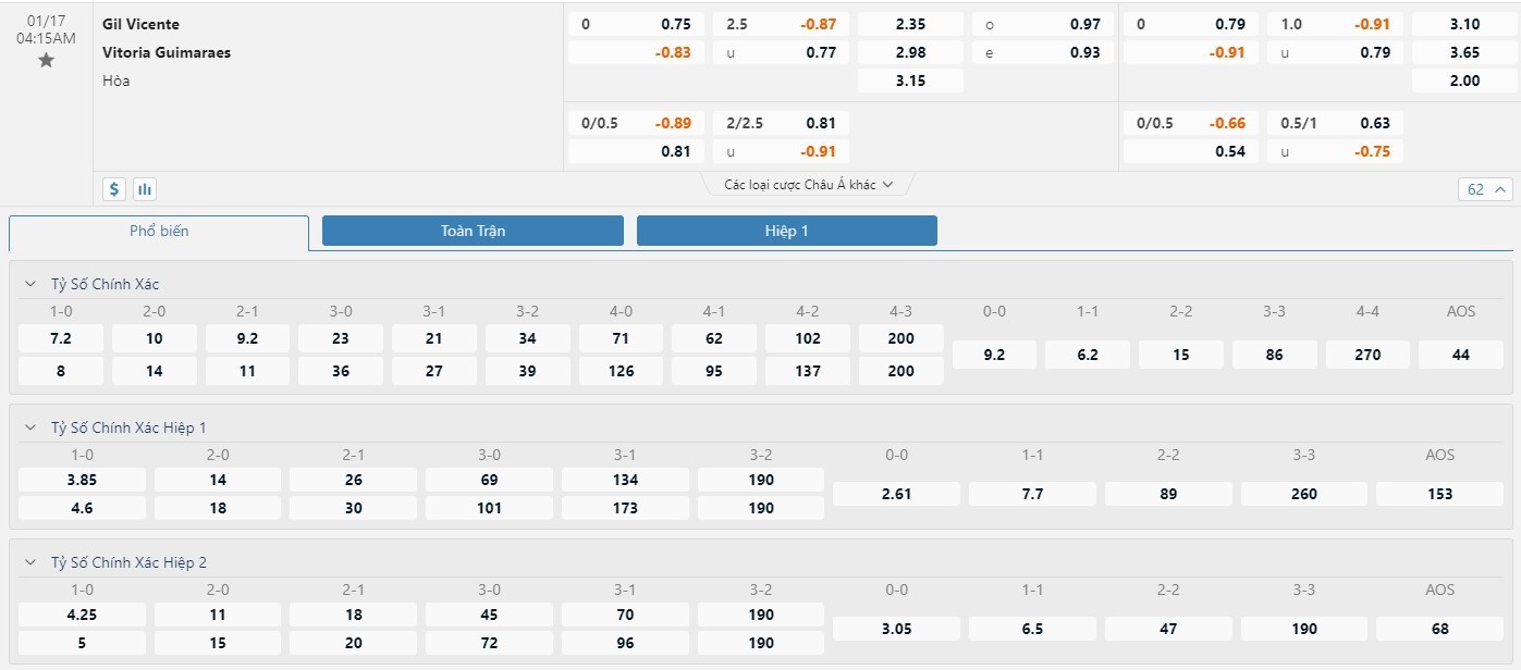 Tip kèo tỷ số hiệp 1: Gil Vicente 1-1 Vitoria de Guimaraes