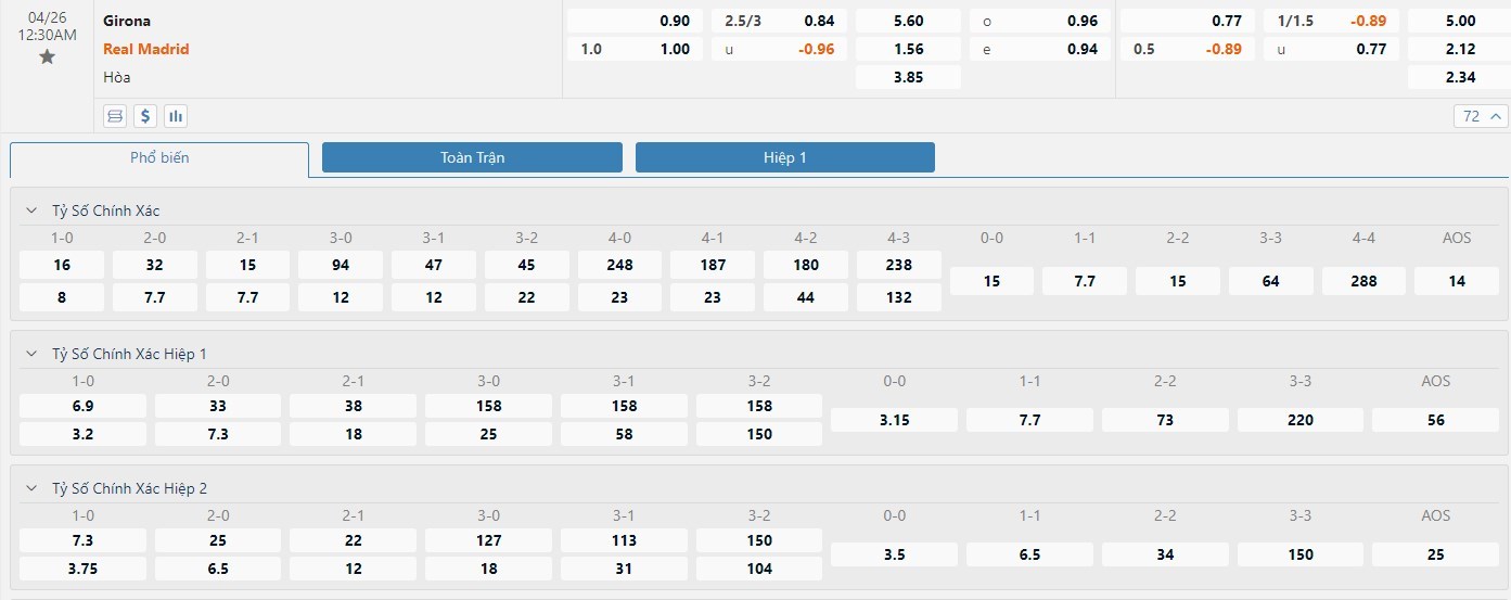 Tip kèo tỷ số hiệp 1: Girona 0-0 Real Madrid