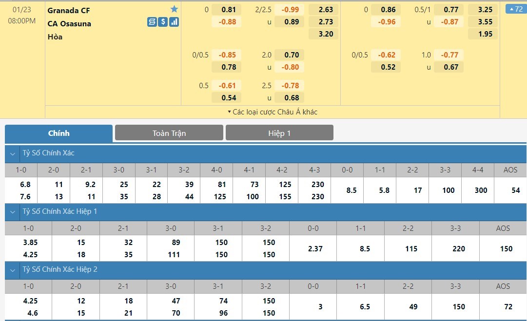 Tip kèo tỷ số hiệp 1: Granada 0-0 Osasuna