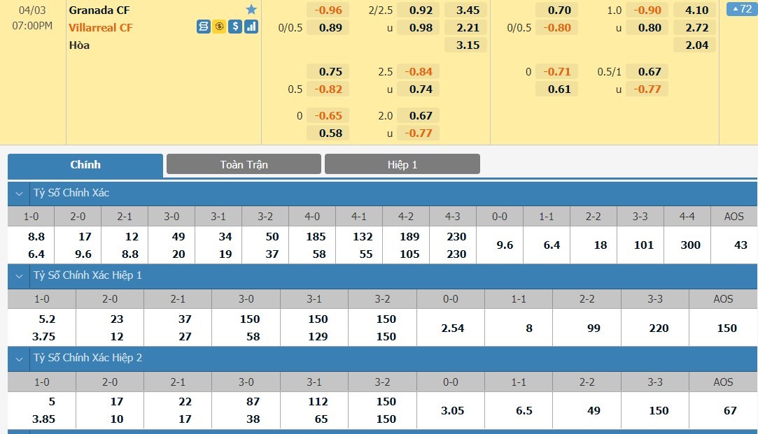 Tip kèo tỷ số hiệp 1: Granada 0-0 Villarreal