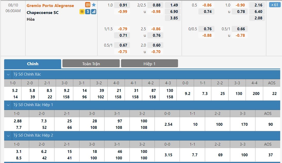 Tip kèo tỷ số hiệp 1: Gremio 1-0 Chapecoense AF