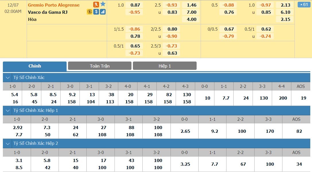 Tip kèo tỷ số hiệp 1: Gremio 1-0 Vasco da Gama