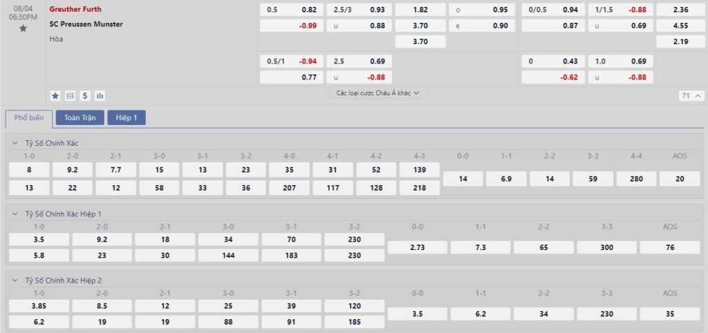 Tip kèo tỷ số hiệp 1: Greuther Furth 1-0 Preussen Munster