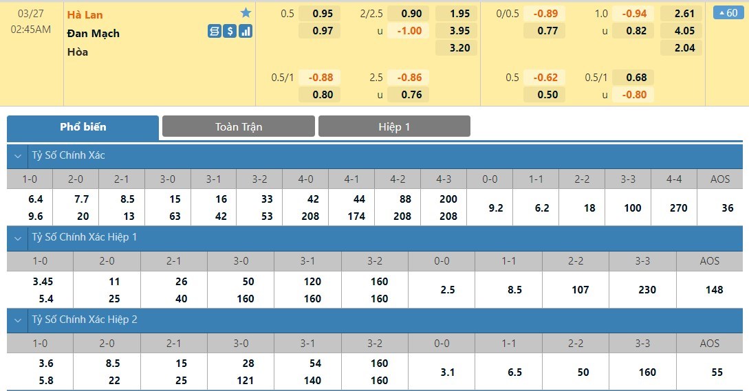 Tip kèo tỷ số hiệp 1: Hà Lan 0-0 Đan Mạch