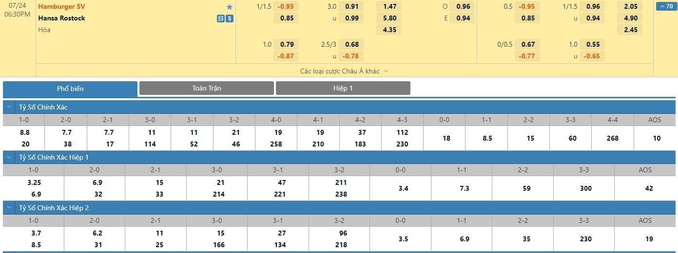 Tip kèo tỷ số hiệp 1: Hamburger 1-0 Hansa Rostock