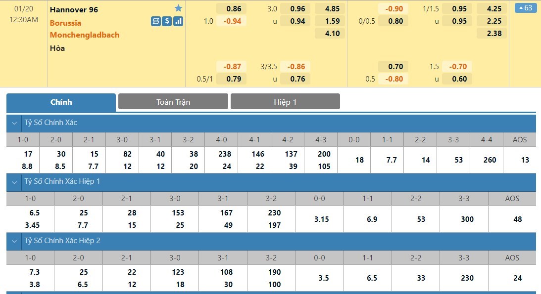 Tip kèo tỷ số hiệp 1: Hannover 96 0-1 Borussia Monchengladbach
