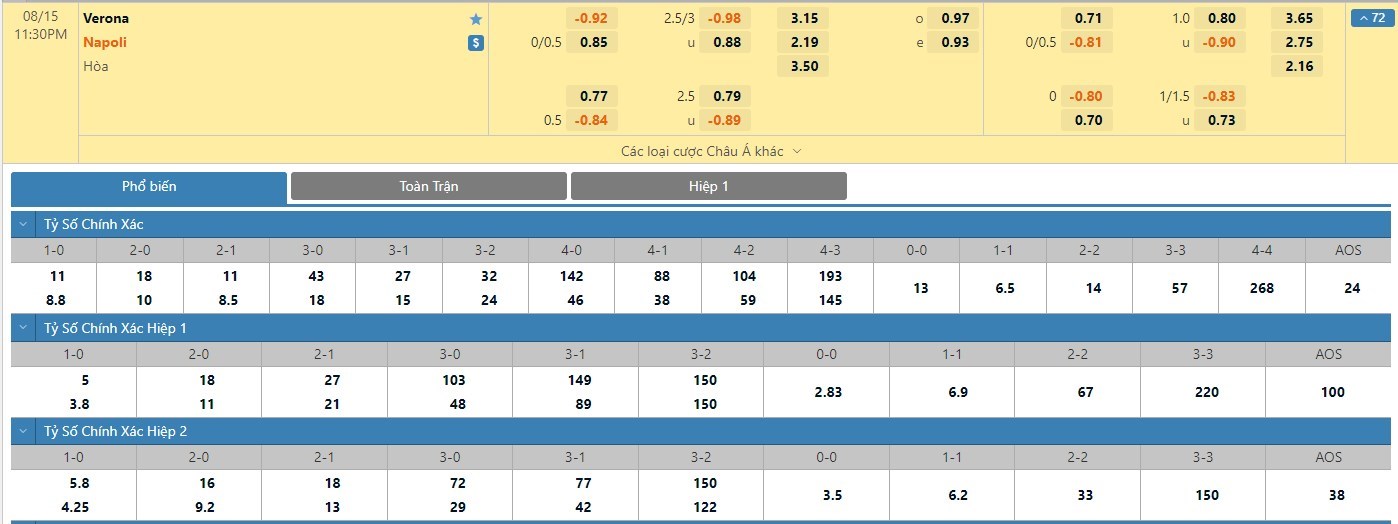 Tip kèo tỷ số hiệp 1: Hellas Verona 0-1 Napoli
