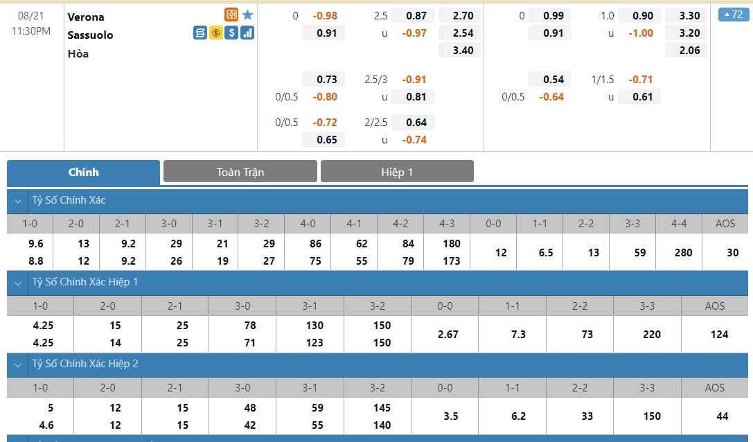 Tip kèo tỷ số hiệp 1: Hellas Verona 0-1 Sassuolo