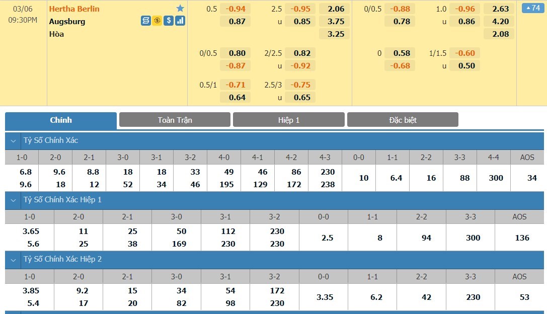 Tip kèo tỷ số hiệp 1: Hertha Berlin 0-0 Augsburg
