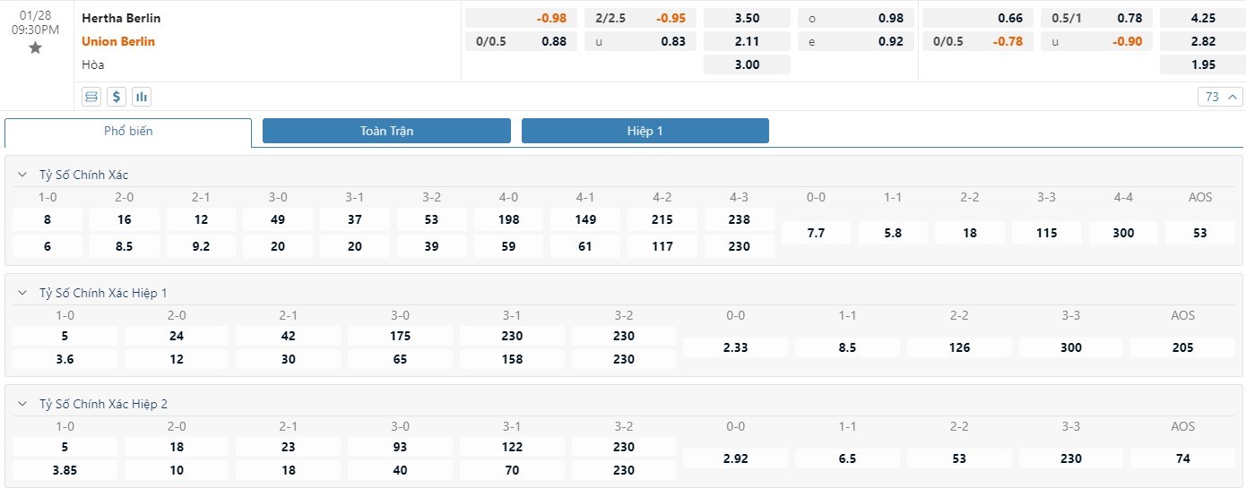 Trái ngược với đội chủ nhà thì phong độ của Union Berlin đang cực kỳ ấn tượng. Với chiến thắng 3-1 trước Hoffenheim mới đây thì chuỗi trận thắng của Union Berlin đã được kéo dài lên con số 7 trận liên tiếp. Sức mạnh tấn công chính là điểm nổi trội của Union Berlin khi họ đều ghi từ 2 bàn thắng trở lên ở 6 trận trong chuỗi trận kể trên. Chứng kiến những gì đội bóng này đang thể hiện thì không bất ngờ khi Union Berlin nhận được đánh giá tích cực từ phía nhà cái. Được xếp ở thế kèo trên cùng mốc chấp -1/4 trái, ô cược Union Berlin sẽ là lựa chọn phù hợp dành cho giới mộ điệu. Thêm nữa, cả 3 lần gần nhất chạm trán giữa hai đội đều có từ 3 bàn trở lên.