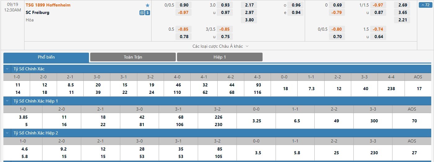 Tỷ lệ kèo được đưa ra ở cuộc đối đầu này là -1/4 trái nghiêng về Hoffenheim và đây là điều tương đối bất ngờ. Thực tế, ngoài yếu tố sân bãi ra thì ở 2 lần gần nhất hai đội bóng này chạm trán nhau trực tiếp, Freiburg mới là đội bóng mang về cho mình thành tích đối đầu tốt hơn với thành tích toàn thắng. Các nhà đầu tư nên tin tưởng vào đội khách trận này để mang về cho mình cơ hội thắng kèo cao hơn.