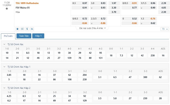 Trong 5 trận đấu gần nhất của mình, Hoffenheim đã có 3 trận đấu mang về được cho mình ít nhất là 1 bàn thắng trong hiệp đấu đầu tiên. Còn với Mainz 05, đội bóng này chỉ có 1 lần làm được điều này trong 45 phút đầu tiên. Với tỷ lệ kèo hiệp 1 là -1/4 trái thì các nhà đầu tư nên tin tưởng vào đội chủ nhà ở trong hiệp đấu đầu tiên này.