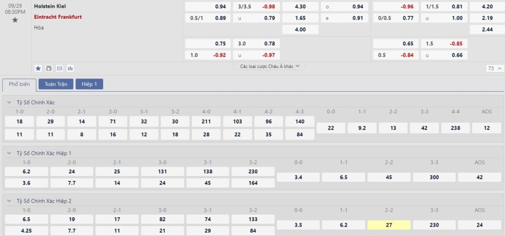 Tip kèo tỷ số hiệp 1: Holstein Kiel 0-1 Eintracht Frankfurt