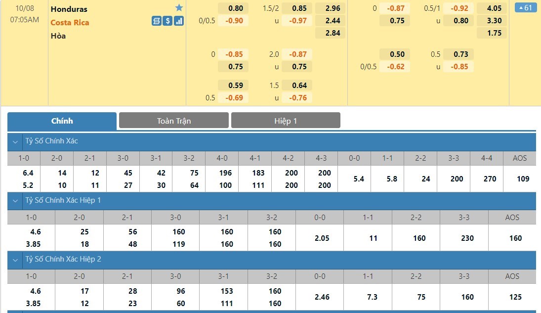 Tip kèo tỷ số hiệp 1: Honduras 0-0 Costa Rica