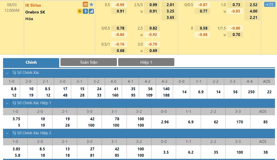 Tip kèo tỷ số hiệp 1: IK Sirius 1-0 Orebro