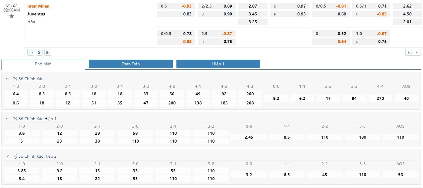 Tip kèo tỷ số hiệp 1: Inter Milan 0-0 Juventus