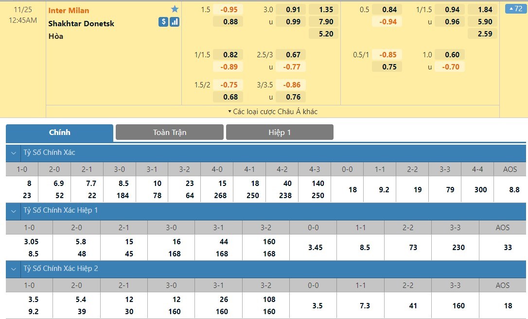 Theo như những kết quả thống kê thì Shakhtar Donetsk chưa từng có được chiến thắng trên sân của Inter Milan. Cụ thể sau 3 lần hành quân tới Giuseppe Meazza thì đại diện của Ukraine chỉ mang về 2 trận hòa và 1 thất bại. Vì vậy việc đặt niềm tin vào Shakhtar Donetsk ở kèo đấu này rõ ràng là 1 quyết định hết sức phiêu lưu. Theo như kết quả thống kê trong 5 lần gần nhất 2 đội gặp nhau thì đã có tới 4 trận khép lại với từ 2 pha lập công trở xuống. Thậm chí ở 3 trận gần nhất đôi bên đụng độ thì người hâm mộ còn chẳng được chứng kiến pha làm bàn nào. Do đó, cửa xỉu là phương án đầu tư hợp lý.