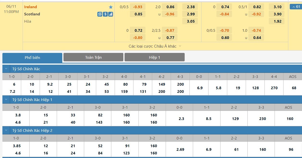 Với những gì đang chênh lệch ở thời điểm hiện tại thì trận đấu này hứa hẹn cũng sẽ diễn ra tương đối cân bằng. Một thế trận chặt chẽ hứa hẹn cũng sẽ được hai đội đặt lên hàng đầu trận này. Do đó, khả năng bàn thắng xuất hiện trong hiệp đấu đầu tiên là không cao. Trong 5 trận đấu gần nhất trên mọi đấu trường, Ireland đã sở hữu cho mình 8 pha lập công cùng với 6 lần phải vào lưới nhặt bóng. Bên kia chiến tuyến, Scotland đã sở hữu 9 bàn thắng, còn lại là việc hàng thủ đã phải nhận 5 bàn thua. Các chuyên gia cũng chỉ đang tin tưởng vào khả năng nổ Xỉu ở cuộc đối đầu này.