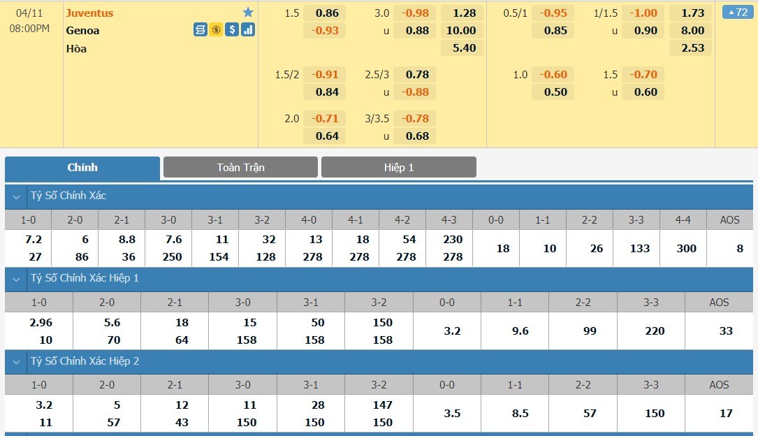 Tip kèo tỷ số hiệp 1: Juventus 1-0 Genoa