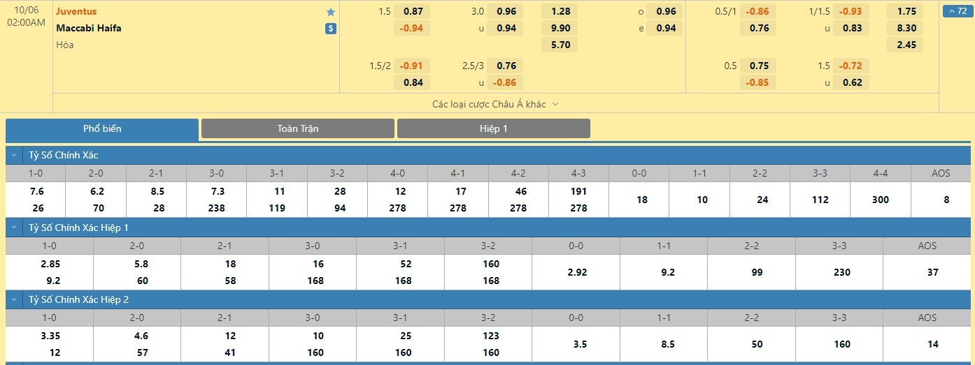 Trong 5 trận đấu gần nhất của mình, Juventus đã có 2 trận đấu mang về được cho mình ít nhất là 1 bàn thắng trong hiệp đấu đầu tiên. Còn với Maccabi Haifa, đội bóng này đã có 2 lần làm được điều này trong 45 phút đầu tiên. Juventus được nhà cái đánh giá cao hơn trong nửa đầu trận đấu. Với những phân tích như ở bên trên, thế trận bế tắc khó được khai thông sớm khi hàng thủ đội khách thi đấu chắc chắn, bước ngoặt nếu có chỉ đến ở cuối hiệp 1 trận đấu. Với tỷ lệ kèo hiệp 1 ở trận đấu này được đưa ra là Juventus chấp -3/4 trái thì người chơi nên tin tưởng vào đội chủ nhà trận này.
