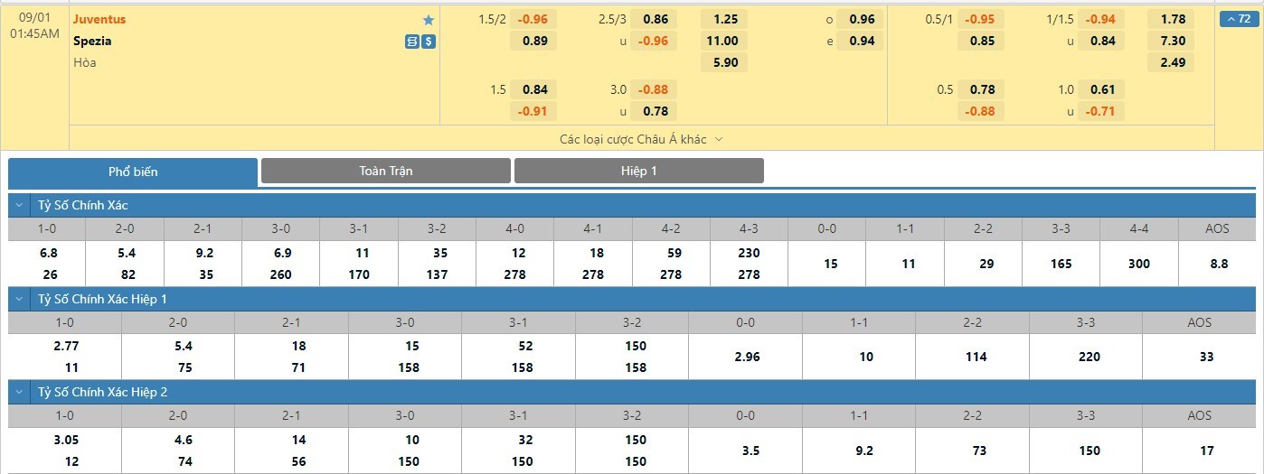 Trong 5 trận đấu gần nhất của mình, Juventus đã có 2 trận đấu mang về được cho mình ít nhất là 1 bàn thắng trong hiệp đấu đầu tiên trong khi Spezia đã có 4 lần làm được điều tương tự. Dễ dàng hình dung ra kịch bản Juventus sẽ là những người lấn lướt về mặt thế trận. Tỷ lệ kèo hiệp 1 ở trận đấu này được đưa ra là -1/2 trái và người chơi nên tin tưởng vào đội chủ nhà Juventus để có sự an toàn lớn hơn. Trong 7 lần gần nhất hai đội chạm trán thì có tới 6 trận xuất hiện bàn thắng trong hiệp 1.