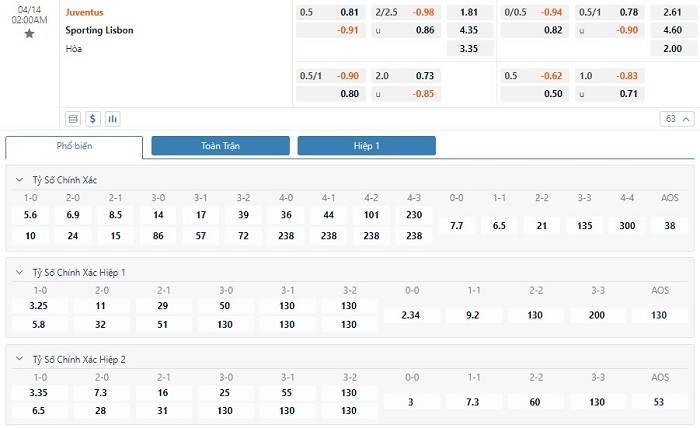 Tỷ lệ kèo ở trận đấu này được đưa ra là -1/2 trái nghiêng về Juventus và tỷ lệ này là không có gì phải bàn cãi quá nhiều. Mặc dù vậy với phong độ thi đấu hiện tại thì các nhà đầu tư nên tin tưởng vào đội khách trận này để mang về cơ hội thắng kèo cao hơn. Trong 5 trận đấu gần nhất hai của mình, Juventus đã có 3 trận đấu mang về được cho mình ít nhất là 1 bàn thắng trong hiệp đấu đầu tiên. Còn với Sporting CP, đội bóng này đã 3 có lần làm được điều này trong 45 phút đầu tiên. Với tỷ lệ kèo hiệp 1 là Juventus chấp -1/4 trái thì người chơi nên tin tưởng vào đội khách trận này.