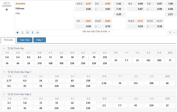 Tip kèo tỷ số hiệp 1: Juventus 1-0 Udinese