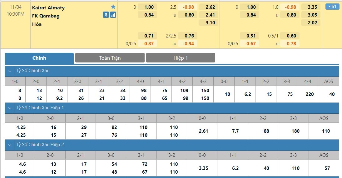 Tip kèo tỷ số hiệp 1: Kairat Almaty 1-1 FK Qarabag