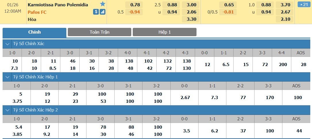 Tip kèo tỷ số hiệp 1: Karmiotissa Pano Polemidia 0-0 Pafos FC